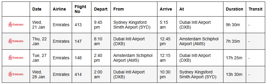 Departing Date: 21/01/2026 // Return Date: 27/01/2026 (arrive 28th)